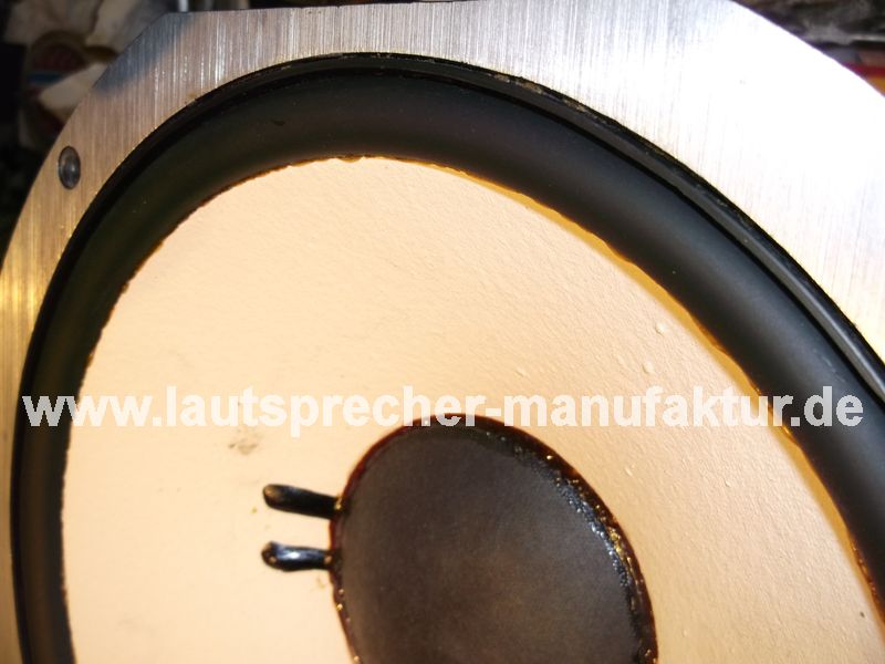 Es wurde eine wie oft beworbene "super weiche" und aus "deutscher Produktion" stammende Gummisicke in einen JBL LE10-A anstatt der Schaumstoffsicke eingebaut. Folgen waren das die Gummisicke einen wesentlich geringeren mechanischen Widerstand hatte und viel mehr Hub zugelassen hat. Dies hatte wiederum zur Folge dass die Schwingspule bis auf die Polplatte eintauchen konnte, und dort aufgeschlagen ist. Zu sehen ist der Schwingspulenträger aus Papier welcher geknickt ist, und die Spule deren Zuleitung abgerissen ist. Reparaturkosten betragen für das Reconing 245 Euro, jedoch ist das original Recone Kit mit Schaumstoffsicke, weshalb das 2. Chassis auch reconed werden muss.