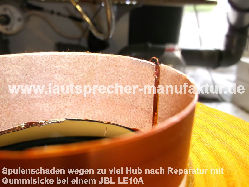 Es wurde eine wie oft beworbene "super weiche" und aus "deutscher Produktion" stammende Gummisicke in einen JBL LE10-A anstatt der Schaumstoffsicke eingebaut. Folgen waren das die Gummisicke einen wesentlich geringeren mechanischen Widerstand hatte und viel mehr Hub zugelassen hat. Dies hatte wiederum zur Folge dass die Schwingspule bis auf die Polplatte eintauchen konnte, und dort aufgeschlagen ist. Zu sehen ist der Schwingspulenträger aus Papier welcher geknickt ist, und die Spule deren Zuleitung abgerissen ist. Reparaturkosten betragen für das Reconing 245 Euro, jedoch ist das original Recone Kit mit Schaumstoffsicke, weshalb das 2. Chassis auch reconed werden muss.
